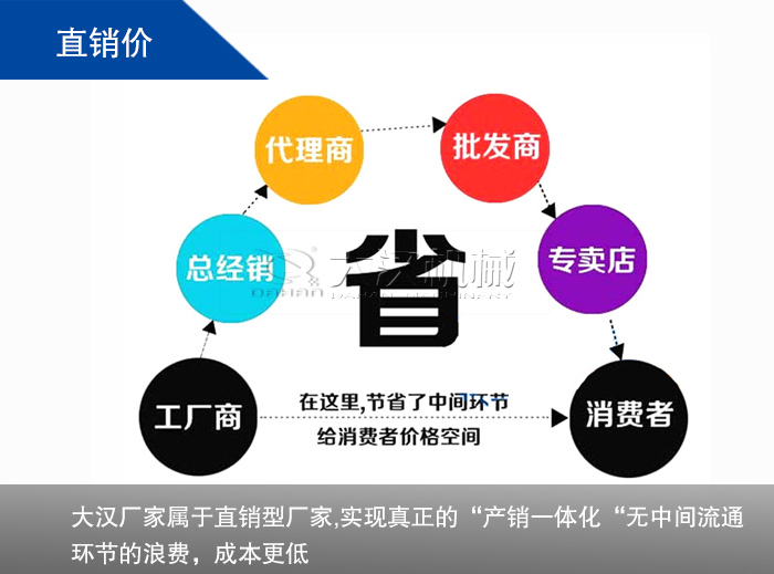 大漢廠家屬于直銷型廠家,產(chǎn)銷一體化,從到原材料采購,生產(chǎn),再到銷售環(huán)節(jié),每道程序都嚴(yán)格把控,實現(xiàn)真正的“產(chǎn)銷一體化“無中間流通環(huán)節(jié)的浪費,成本更低。
