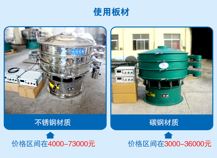 也就是材質(zhì),超聲波旋振篩的材質(zhì)大多就是不銹鋼、碳鋼、塑料這三種。其中,不銹鋼的價(jià)格貴,碳鋼次之,塑料一般針對(duì)特殊物料,尤其是腐蝕性較強(qiáng)的化工物料的篩分。不銹鋼也分有多種,包括201、202、304、316、316L等類(lèi)型,這一型號(hào)質(zhì)量從前到后排列。不銹鋼旋振篩價(jià)格區(qū)間在4000-73000元,碳鋼旋振篩價(jià)格區(qū)間在3000-36000元不等。