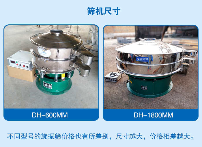 很明顯,篩機(jī)尺寸越大,運(yùn)行功率也越大,篩分能力也就越強(qiáng)。不同型號(hào)的旋振篩價(jià)格也有所差別,以大漢為例,同等條件下的篩機(jī)DH-600MM要比DH-400MM貴2000元,尺寸越大,價(jià)格相差越大。